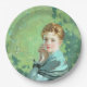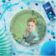 This design features a painting by the Scottish artist George Henry (1858–1943), who was one of the most prominent members of the Glasgow School of art. It is a portrait of a beautiful young woman named Felicity. She is seated at a table and she is wearing a turquoise-blue dress. Her elbows are resting on the table and she is holding her hands together beside her face. Felicity is starting intently at the viewer. She is clearly an elegant woman. Her chestnut-brown hair is fashionably styled and she is wearing a scarf over her dress, that is a slightly darker shade of turquoise than the dress itself. There is greenery in the background, suggesting that she is sitting outside in a garden. The original artwork was painted by George Henry in 1916.