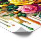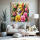 1. Step into a world of enchantment with this exquisite piece of art featuring a vibrant and whimsical portrayal of a colourful cat nestled among a bed of roses. The stylised cat exudes elegance and grace, with its serene eyes gazing out at the viewer, inviting them to get lost in the intricate details of the scene.