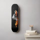 This captivating skateboard deck design features the side profile of a majestic cat rendered in stunning detail against a sleek black background. The feline’s gaze is steady and thoughtful, with its fur illuminated by gentle gradients of warm light. What truly sets this design apart is the flowing, golden-orange ruffled texture adorning the cat’s neck, reminiscent of artistic drapery or a regal collar. Subtle dots scattered in the background add a celestial or dreamy quality, enhancing its sophistication.