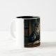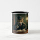 This two-tone ceramic mug features a captivating illustration of a feline detective, complete with a magnifying glass and a thinking cap, investigating a puzzling crime scene.