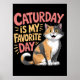 This charming graphic features a happy multi-coloured cartoon cat, predominantly orange, white, and grey, sitting contentedly with wide, expressive eyes and a joyful, open-mouthed smile. The bold pink text at the top declares "CATURDAY," while the white and yellow text below emphatically states "IS MY FAVORITE DAY," capturing the delightful anticipation of a cat-centric weekend. The design is set against a solid black background. Digital download for personal use only.