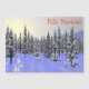Features an image of the mid-winter taiga (boreal forest). Cold and covered in snow. Low on the horizon a pale, yellow sun hovers just above the mountains. A snowshoe hare runs for cover in the foreground. Spanish text reading "Feliz Navidad" also appears in red.