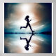 Female runner silhouette is mirrored below with a soft pastel sunset sky as backdrop