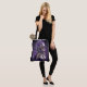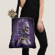 Female Skeleton Cameo Style Portrait Tote Bag. © Dark Heart Desires. This Gothic tote bag has a female skeleton with silver hair, purple roses and jewellery on a purple damask background.