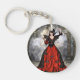 3D digital render of a beautiful female wizard in a red and black dress with wings on a fantasy spooky castle background