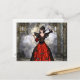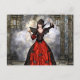 3D digital render of a beautiful female wizard in a red and black dress with wings on a fantasy spooky castle background