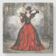 3D digital render of a beautiful female wizard in a red and black dress with wings on a fantasy spooky castle background