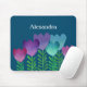 Personalise this feminine and pretty mouse pad. Pink, blue and purple flowers and green leaves on a teal blue background.