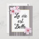 This feminine, chic postcard contains the French phrase "La vie est Belle", or "Life is Beautiful" in black elegant script with a faux gold foil thin frame. The border of the postcard is made of Parisian black and pink stripes, and beautiful illustrated cherry blossoms decorate the corners.