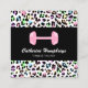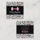 Modern female fitness trainer business cards featuring a multi-coloured rainbow leopard print background, a pink dumbell, your name, title, contact details, and social media icons. This would make a perfect business card for anyone who trains people whether you work in a gym or for yourself. The icons can be removed by clicking on personalise and then tap to customise further.