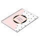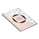 A blend of pastel pink colour block and chic black and white polka dots pattern give this personalised notebook a chic trendy style. The frame inset in the centre of the design combines a double geometric frame with a black circular background to personalise with your name or other desired text.