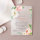 A beautifully feminine baptism invitation featuring a corner bouquet of watercolor poppies, roses, eucalyptus and trailing greenery in soft pastel pink, beige, green and blue-green on a frosted acrylic card. Trendy type face pairings include handwritten script and elegant serif. Personalise the easy to use text template with your event details.