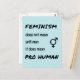 This is a positive statement about feminism, a humanist, inclusive attitude: "FEMINISM does not mean anti-men, it does mean PRO HUMAN". This is an antidote to all those old man-bashing and feminist-bashing slogans.