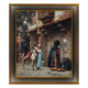 This is classical orientalist style genre scene of people in possibly a North African village with a centre focus of a young man that is a servant to a prominent lady of the village...