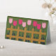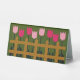 Image printed on table tent is from a photo of an original floral tapestry crochet wall hanging designed handmade and Copyright © by published designer Delores Chamblin. The picture of the unique handcrafted rustic wood fence, green grass and pink tulips is reproduced on the stand alone tent.