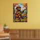 This charming artwork features a bear dressed as a firefighter, complete with a helmet and sunglasses, playing an acoustic guitar while seated on a rustic wooden fence. The background shows colourful autumn leaves on the trees and scattered on the ground, creating a vibrant fall setting. A jar of honey sits on a post next to him. The painting uses thick, textured brushstrokes, giving a whimsical and heartwarming feel, with "Love My Honey" written below.