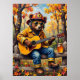 This delightful painting portrays a bear dressed as a firefighter, wearing sunglasses and a helmet, strumming an acoustic guitar while perched on a weathered wooden fence. The background is a vibrant autumn forest with trees in full fall foliage and scattered leaves on the ground. A jar of golden honey is placed beside it on a fence post. The thick, textured brushstrokes enhance the whimsical and sweet nature of the scene, with "Love My Honey" prominently displayed.
