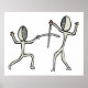 Fencing design shows two dueling experts with epees and masks - demonstrating thrust and parry stances. Cool graphic for fencing enthusiasts.