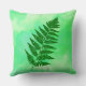 Throw pillow in a silhouette of a single fern frond, in emerald green, against a soft mint green watercolor background