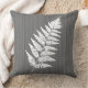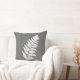 Throw pillow in a silhouette of a single fern frond, in white, against a charcoal grey / grey, faux shantung silk textured background