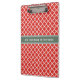 As you can see, this design showcase a personalised Moroccan quatrefoil pattern on both sides of the clipboard. The elegant trendy ferrari red background seamlessly harmonises with the crisp white quatrefoil graphic. Placed just below the centre on the front, a sage green rectangle space, bordered by slender white lines, provides ample room for customisation. Whether it's your name, company slogan, or a cherished quote, this design invites personal expression. The fonts and colours are meticulously selected to resonate with modern aesthetics, suitable for diverse uses.