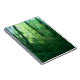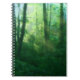 Rays of the morning sun streaming into a brilliantly green summer forest, with massive ivy-covered trees and a thick blanket of underbrush. A photograph digitally manipulated to give the over-grown vines, blue-green mist, golden god-rays, and spring green tree leaves a dream-like quality.