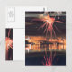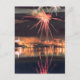 Fireworks explode over the waterfront and reflect off the Hudson River.