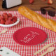 Merry Xmas with a festive and sparkling shot glass on a red and white paper plates.