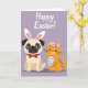 Designed with a soft lavender background, this card features two animated animal friends posed close together, their gentle body language suggesting easy friendship with a hint of romance. A light-furred dog sits low in the frame with wide-set eyes and a slightly wistful look, wearing a red bow tie and tall bunny ears lined in white and pink 🐰. Beside the dog stands an orange cat with a round, cheerful face, topped with small pink-and-white blossoms like a spring crown 🌷. The cat holds a decorated egg at chest level, patterned with neat blue-and-white stripes that draw the eye. Near the top, the words “Happy Easter!” appear in white lettering, centered and spaced above the characters for balance. The warm red bow tie and bright orange fur stand out against the cool purple backdrop, while the blossoms add a tender, affectionate touch between the two. Small highlights along the bunny ears, the egg stripes, and the flower petals give the scene a smooth, softly shaded finish.