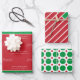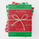 This item includes three sheets with coordinating designs. The first sheet consists of a white typography pattern with the words "Merry Christmas" and a name template on a red and green background. The second is a red, green, and white modern striped pattern. The third sheet depicts a pattern of red circles and green geometric designs.