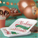 These festive holiday paper plates features the phrase "Baking Spirits Bright" in Christmas red, green and gold colours. Design includes a santa hat, holly with berries, Christmas cookies and starburst accents.