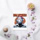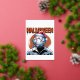 The design is features a baseball with a face, wearing a Santa hat and wrapped in colourful Christmas lights. The baseball’s expression is neutral, with two simple eyes and a straight line for a mouth. The word “HALLOWEEN” is printed above the baseball in large, bold, orange letters. The black background contrasts with the bright colours of the text and Christmas lights, creating a festive and playful design that combines elements of both Halloween and Christmas.