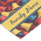 Customise this festive red, blue and yellow bell pattern table runner with your family name. Perfect for Christmas Holiday Season decor!