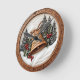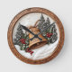 A beautifully carved wooden bell, adorned with holiday greetings, hangs amidst snowy evergreens and vibrant holly. This enchanting decoration captures the essence of winter cheer, inviting warmth and joy during the festive season.