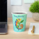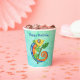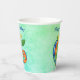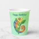 These paper cups are mix of shades of blue and green with a festive fantasy lizard in bright colours of green, blue, yellow, orange holding a green leaf on a stick. Customise the Happy Birthday text with the templates on the front and back.