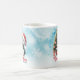 This festive blue and red personalised coffee mug features the "Merry Christmas" saying and the family name template decorated with a cute penguin in a red Santa hat decorating a Christmas tree.