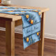 Customise this pretty, festive Oranges and Pine Garlands on a blue background table runner with your family name. Perfect for Christmas Holiday Season decor!