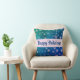 Festive Blue Pink Snowflake Pattern Happy Holidays Throw Pillow. The design has pink snowflakes in different shapes and sizes on a blue turquoise background. You can change the text.