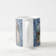 Festive blue hand drawn boho pattern, 2 photo family holiday mug. Design features two arch frame photo spaces, Bright and Merry word-art logo, text lines for family name and year.