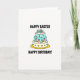 This greeting card features a multi-tier celebratory cake centered on a bright white background, drawn with smooth lines and a soft palette of blues and whites with accents of pink, green, yellow, and orange. At the top, four colorful candles stand upright with small flame shapes, adding a sweet, wish-making touch. The middle tier is decorated with tiny orange root vegetables, arranged like a shared inside joke between close friends. Along the wide bottom tier, several small long-eared animal figures in warm brown sit together among little golden starbursts, their gentle closeness suggesting an affectionate bond 🐰. The cake rests on a golden-yellow stand that frames the design like a sunny tabletop. Above the cake, a bold greeting in dark lettering is centered near the top, and a second line of matching text sits below the stand to balance the layout 🌷. Small orange carrots dot the middle tier while the brown long-eared figures line the base beside scattered golden bursts.