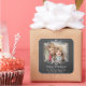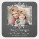 Completely customisable photo sticker featuring beaded and swirly white frame with optional drop shadow overlay on black chalkboard background with festive holiday greeting and decorative ornament with one line of customisable text.
