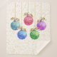 Cosy, bright and elegantly-coloured Christmas balls with lots of visual texture — decorated with lively a gold-toned bows and glitter-like confetti background. Pinks, blues, aquas, greens and violets. Illustrated by artist L. Diane Johnson PSA.