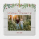 This Christmas ornament features trendy hand-drawn winter greenery along the top with a clean white background. Personalise with your family name, photo, and date.