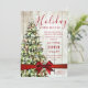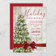 Elegant Christmas / Open House / Dinner Party Invitation template with "Christmas Tree with Fairy lights" & Red Ribbon on rustic wooden background. Impress your friends with this sophisticated and elegant invitation design. Fully customisable!