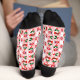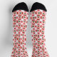 Festive Christmas pattern featuring red stockings, holly leaves, berries, and snowflakes.