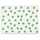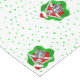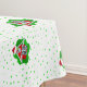 This table cloth is white covered in vibrant green dots with bright red and green splatter shapes that have festive fun skeletons holding snowflake ornaments up to their eyes wearing red Santa hats.