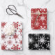Festive snowflakes and sparkles patterned wrapping paper set, perfect for your Christmas gifts for family and friends. The design consists of different snowflake designs, sparkles and splatters in a pattern one white and red, another red and white and the other black and white. This snowflake pattern instantly creates the wonderful Christmas feeling of joy and festivities.