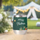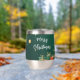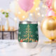 This thermal tumbler features a beautifully decorated Christmas tree adorned with golden ornaments and twinkling lights. The tree is surrounded by an array of colourful gift boxes, each wrapped with ribbons and bows, creating a joyful and celebratory atmosphere. The background is a rich green, complemented by hanging golden baubles and stars, adding a touch of elegance and warmth.