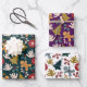 A set of 3 Christmas themed patterns with Gingerbread men, Christmas trees, festive leaves, holly berries and Christmas bells with the colours dark green, purple, and white.