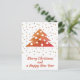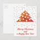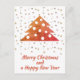 Festive Christmas Tree and Snowflakes Merry Christmas and a Happy New Year Script Holiday Postcard. The colours are festive red, orange and golden.